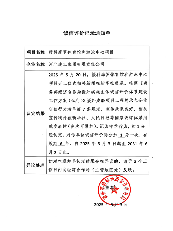鉴黄师 喜获商务部诚信评价嘉奖 近日,鉴黄师 收到商务部国际经济合作事务局《诚信评价记录通知单》。集团公司因援科摩罗体育馆和游泳中心项目开工仪式宣传效果良好,宣传稿件被新华社、人民日报等国家级媒体采用或发表的守信行为,喜获诚信评...
